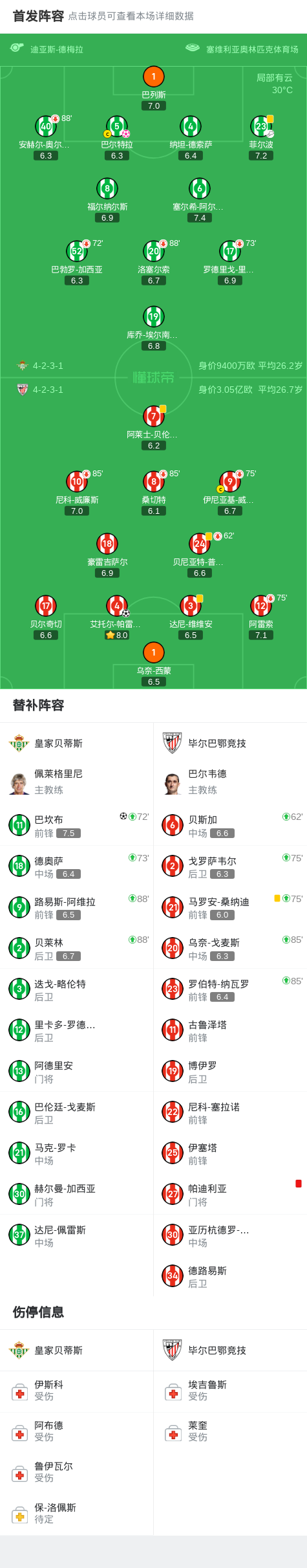 第61分钟,打破僵局,巴尔特拉不慎自摆乌龙,毕尔巴鄂竞技1-0